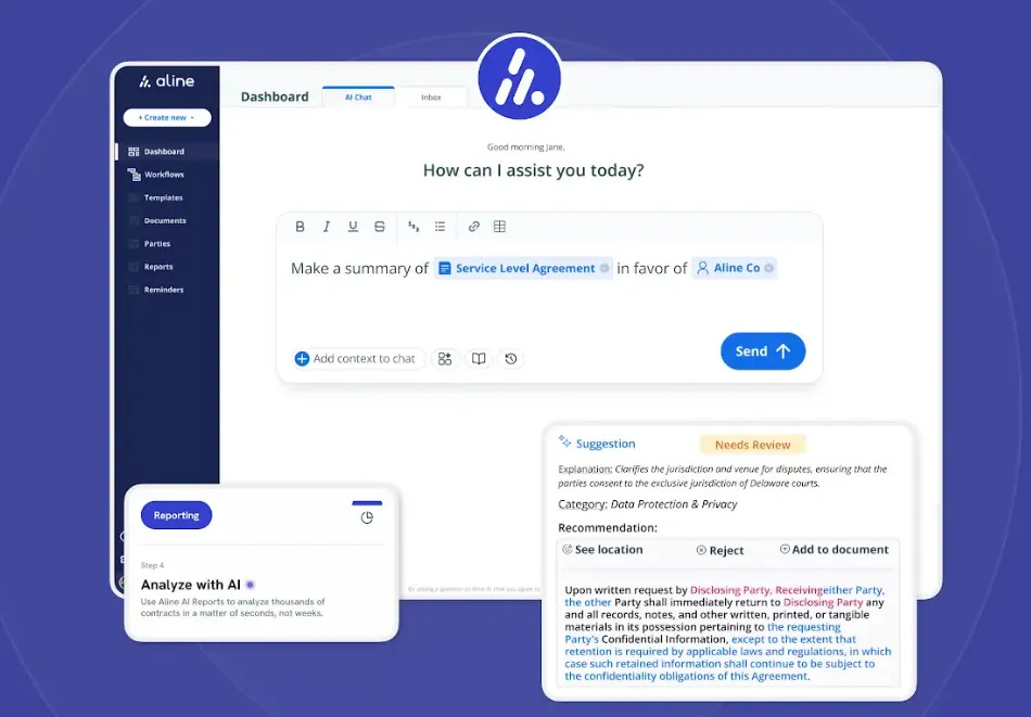 Book a demo to try Aline for free. Explore our AI contract repository and reporting, plus 25% off your first year with code George.